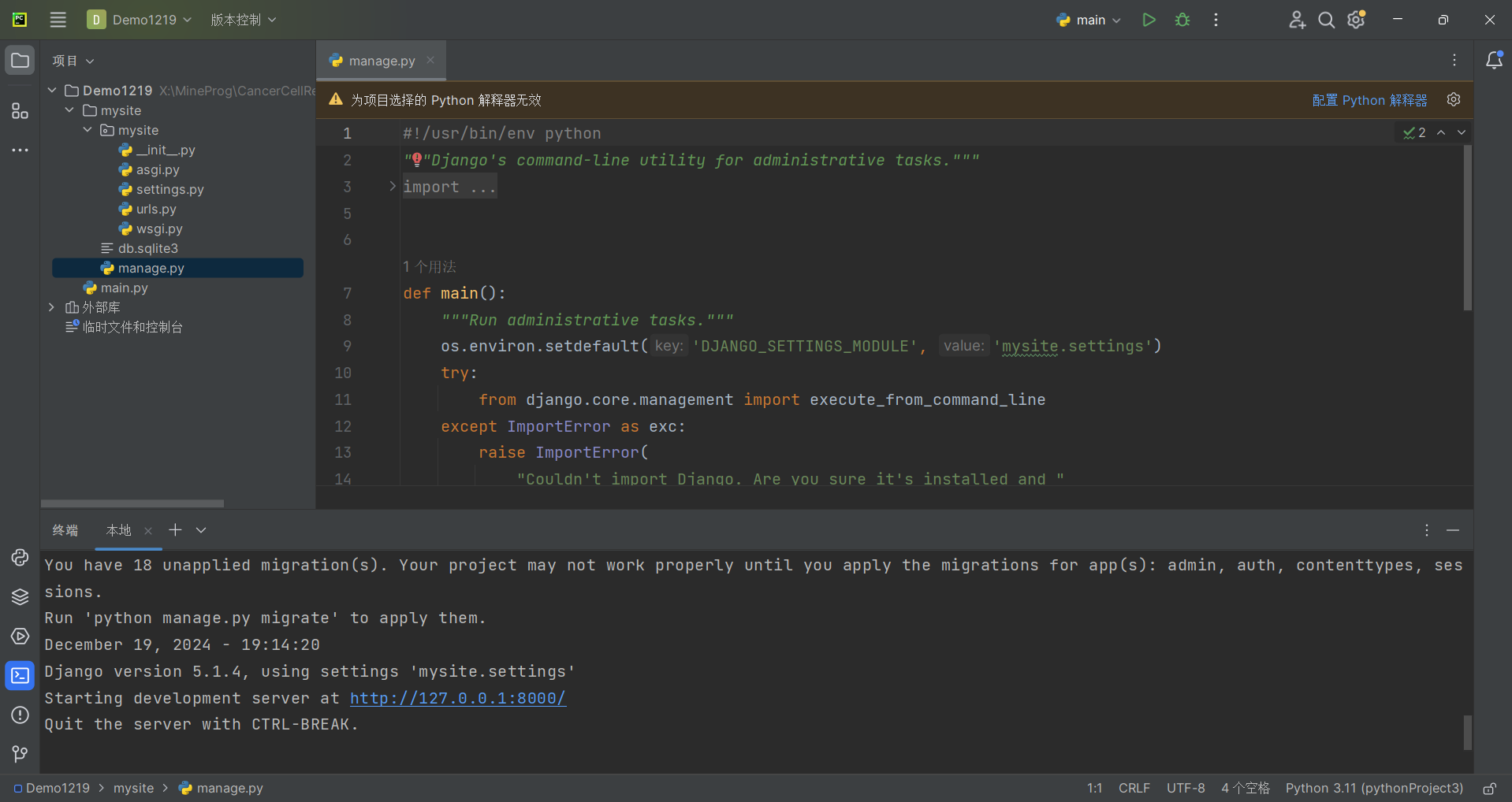 1 | python manage.py runserver #运行manage.py,启动项目 |