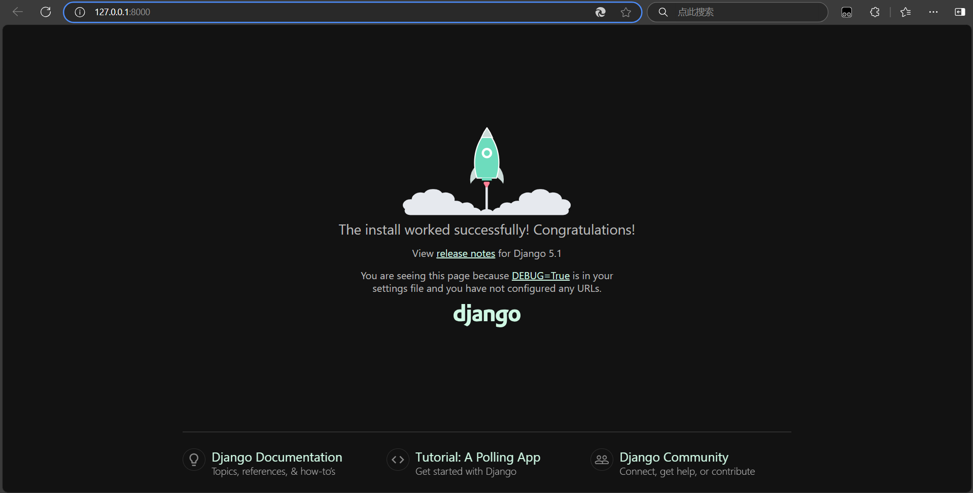 点击蓝色链接 http://127.0.0.1:8000/ 跳转