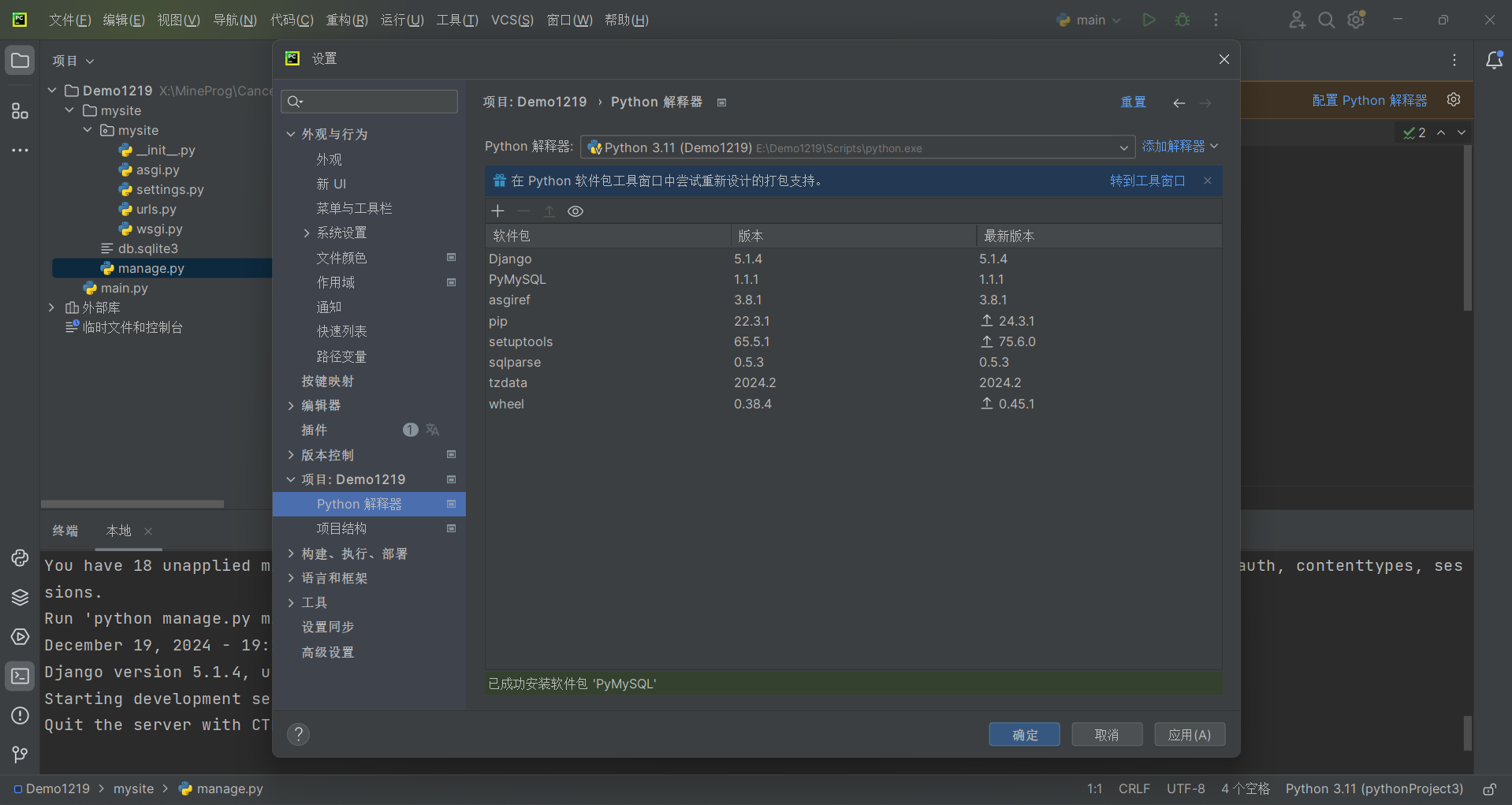 应有上述安装包(最重要的时 Django 与 PyMySql)
