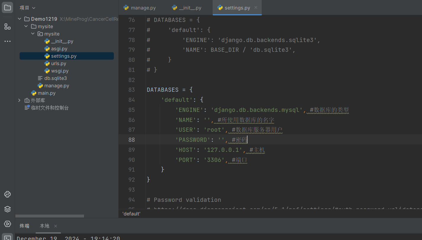2.打开同级目录下的 settings.py 文件,将数据库相关配置设置为