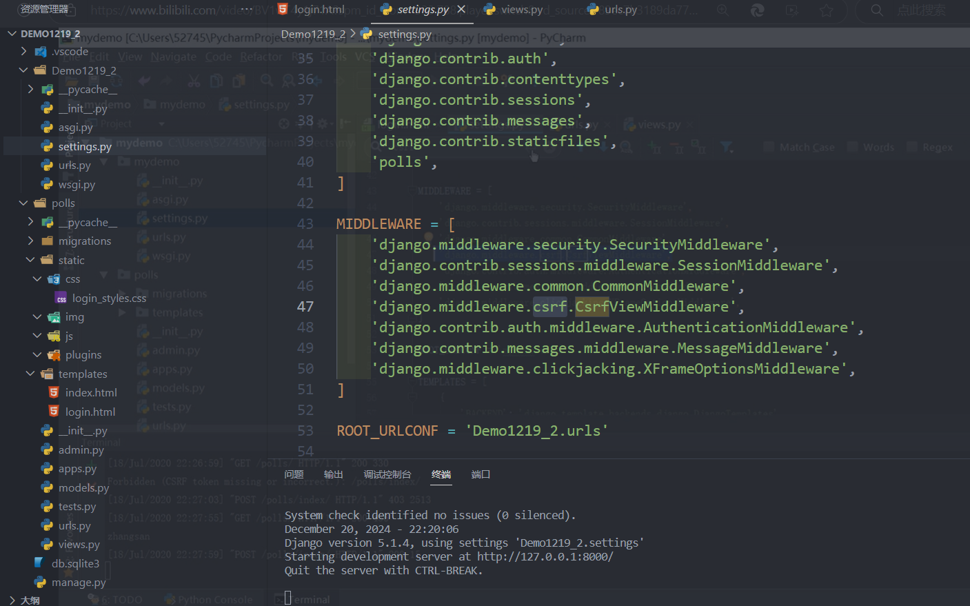 访问时会按照 Demo1219_2-> urls.py ==》 polls -> urls.py ==》 polls -> views.py ==》最后打开 login.html 页面